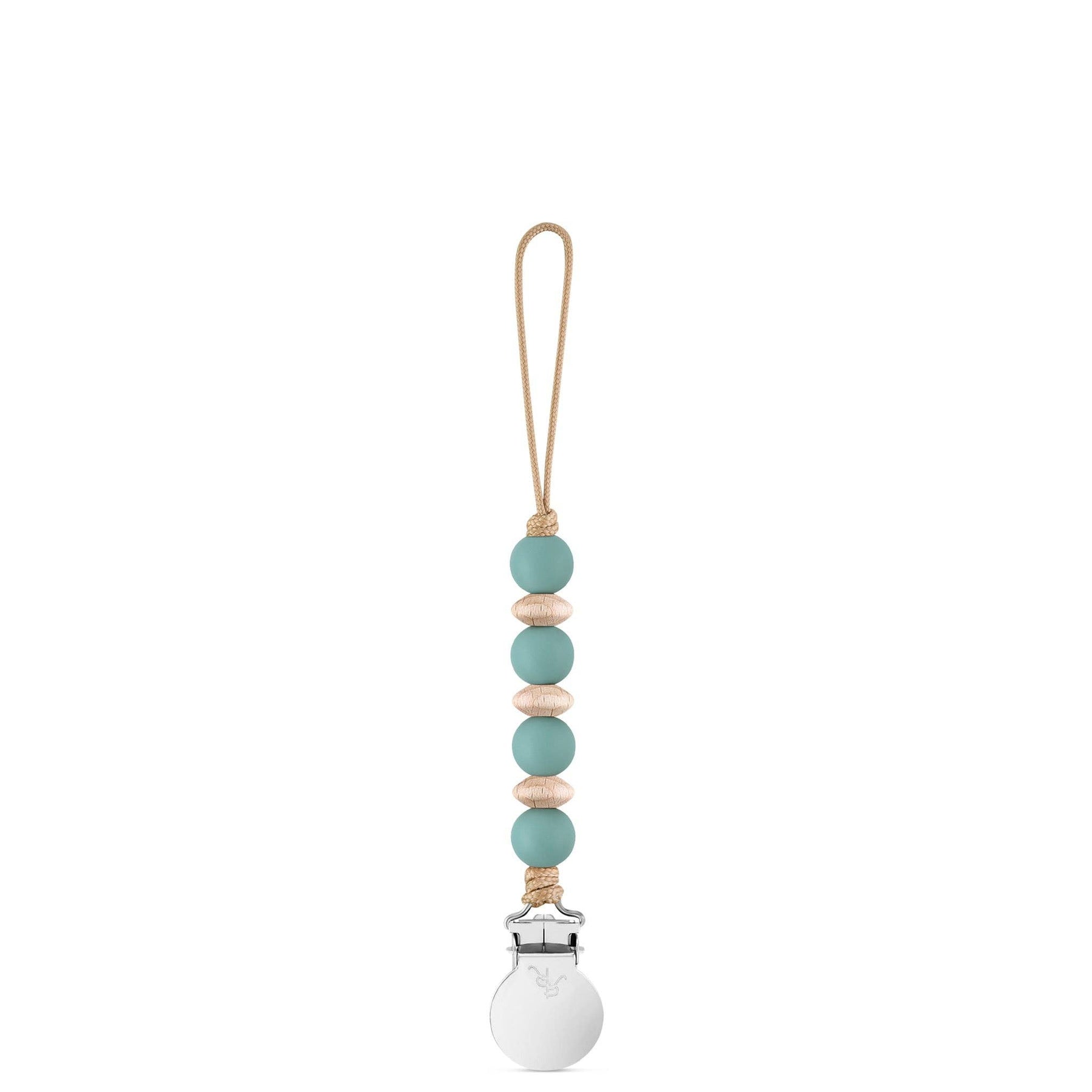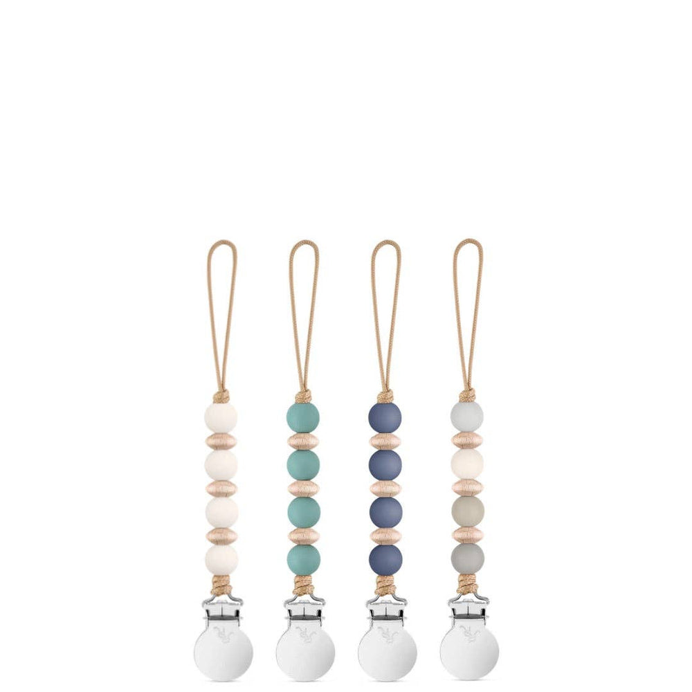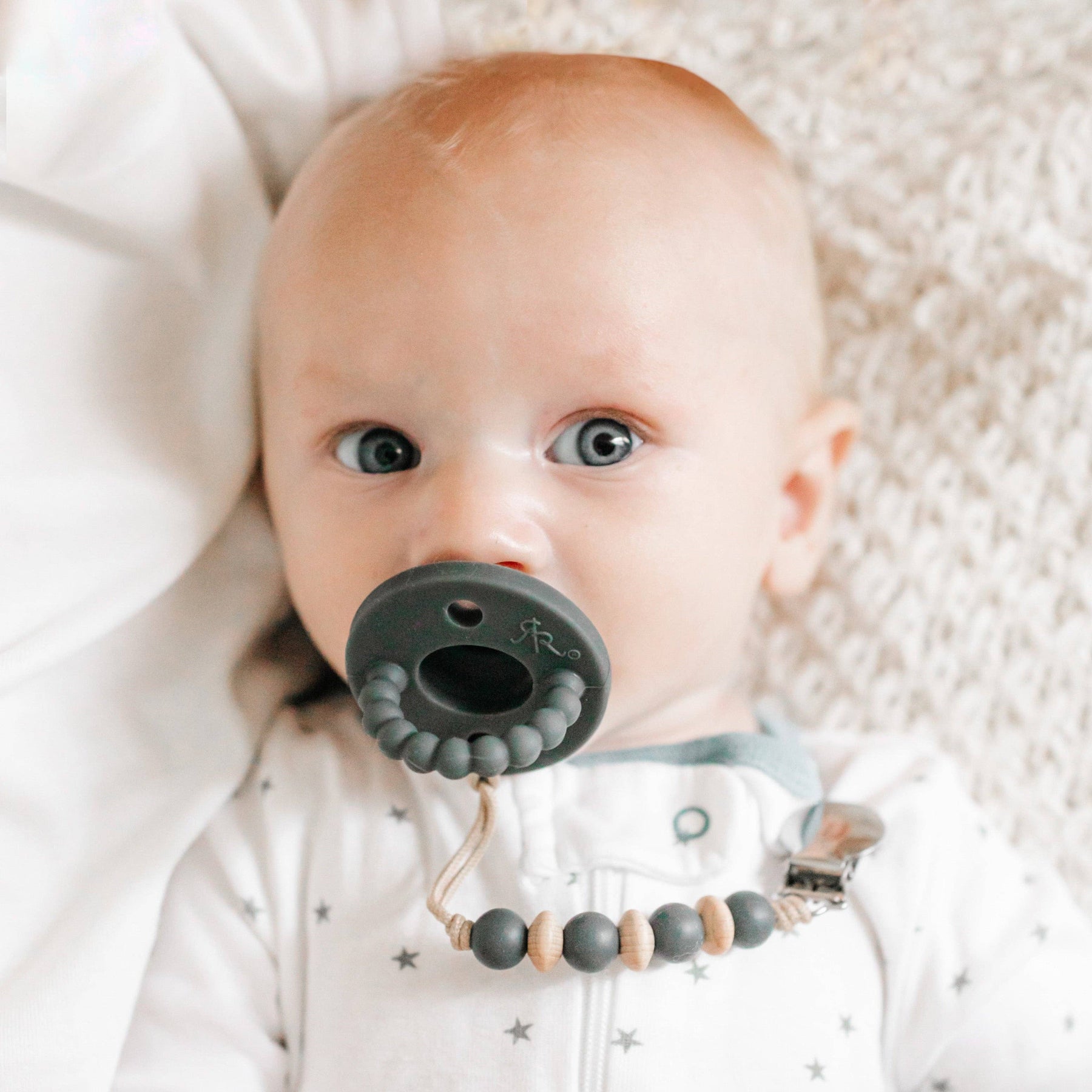 PURPOSE: Teether + Clip in one STYLE: Beaded LENGTH: Mini Clip, approximately 6.5"- 7.5" MATERIALS: Nylon cord, 3 lentil natural beech wood beads, 4 medium food grade silicone beads, and a lead free stainless steel Ryan & Rose clip. Made in Tennessee, USA with imported materials. Look for our signature lengths, beaded designs, knots, unique construction, cord material, and branded metal clips. These factors represent an authentic Ryan & Rose Cutie Clip. Cutie Clips that are requested to be made into lanyards are not intended for children under 5. Choking hazard. Contains small parts. Made with nylon cord. No breakaway clasp. Don't want to lose it, Cutie Clip it!