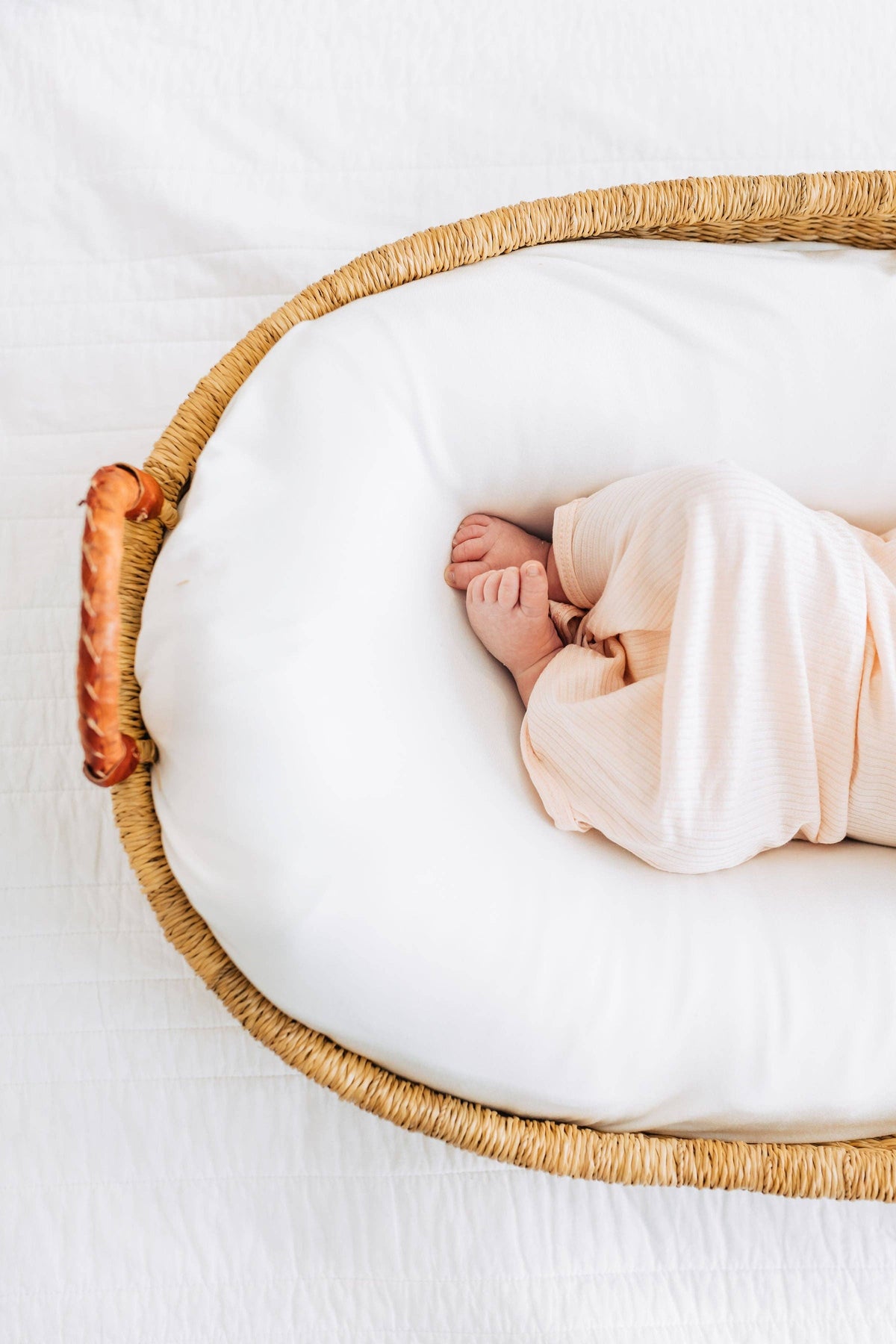 The easiest tie-bottom outfit for day or night. Made for hassle free diaper changes and gentle dressing, I designed this with a button-down front and tie bottom for simple closure (no more snaps at 2am!). Fold over wrist cuffs are the most thoughtful finishing touch. Sizes: Newborn-3 Months: Fits approximately 5-15 lbs 3-6 Months: Fits approximately 15-25 lbs Color: Light Blush Ribbed